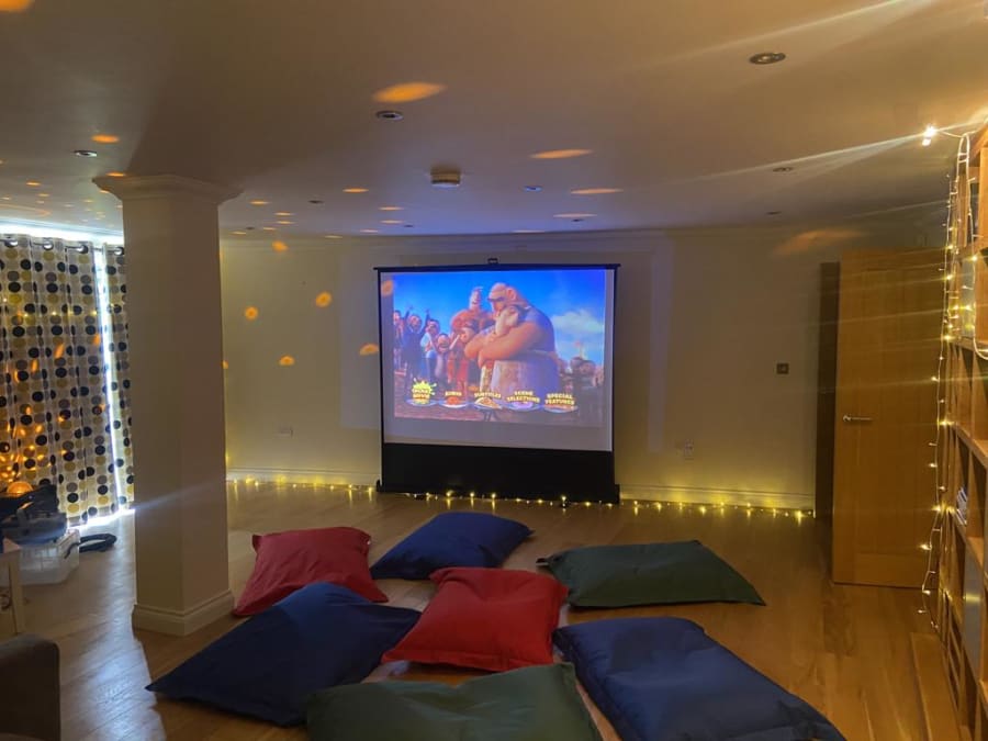 Indoor Cinema Package with Projector, Screen, Speaker, Disco Lights, Bean Bags and Fairy Lights) for hire in Buckinghamshire, Berkshire, Middlesex and Oxfordshire.